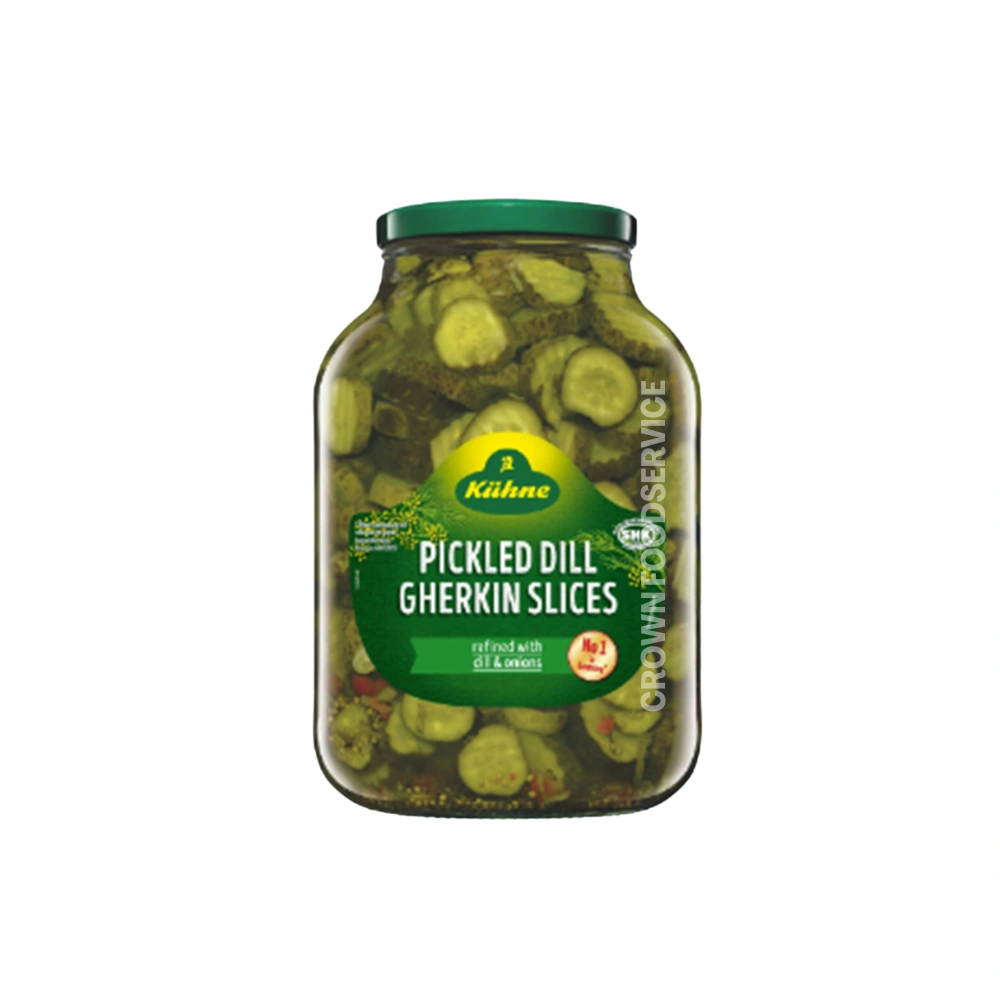 Kuhne Pickled Dill Gherkins Slices 2.45kg deliver a classic, tangy pickle experience with the refreshing crunch of dill-infused gherkin slices. These premium-quality gherkins are carefully pickled in a special blend of dill and spices to preserve their fresh taste and texture. Perfect for adding a zesty kick to sandwiches, salads, burgers, or as a standalone snack, they offer versatility in the kitchen. The large 2.45kg jar is ideal for both commercial kitchens and households with a passion for pickled goods.